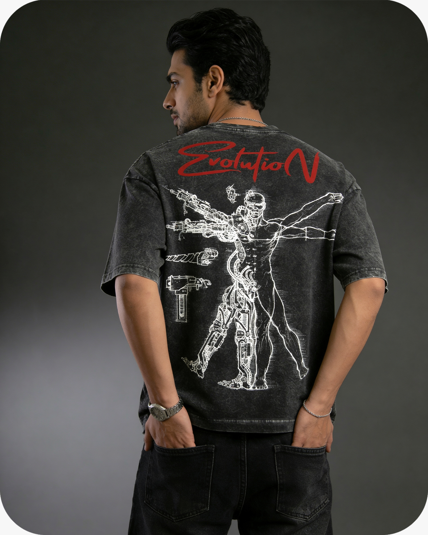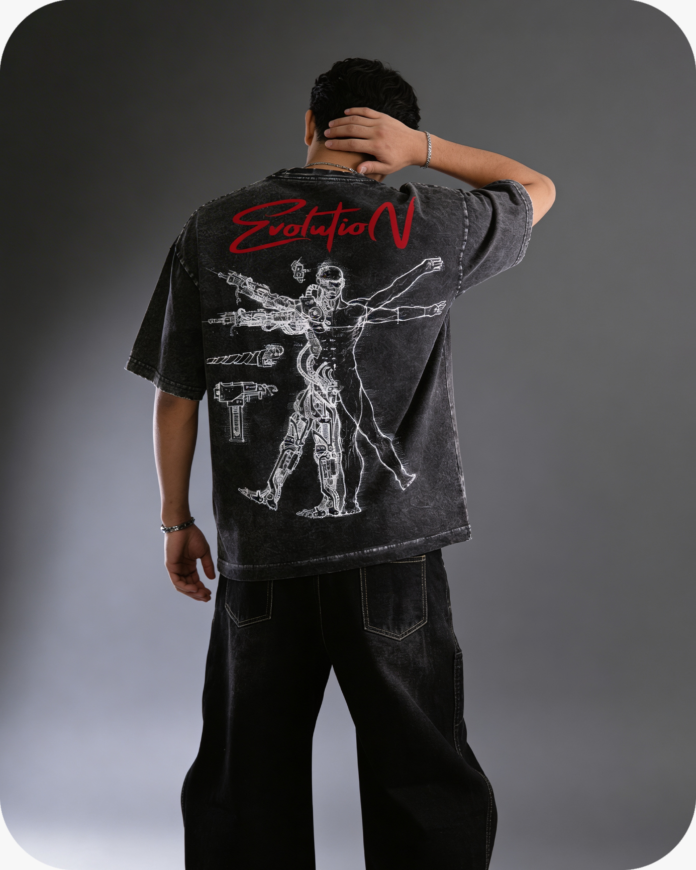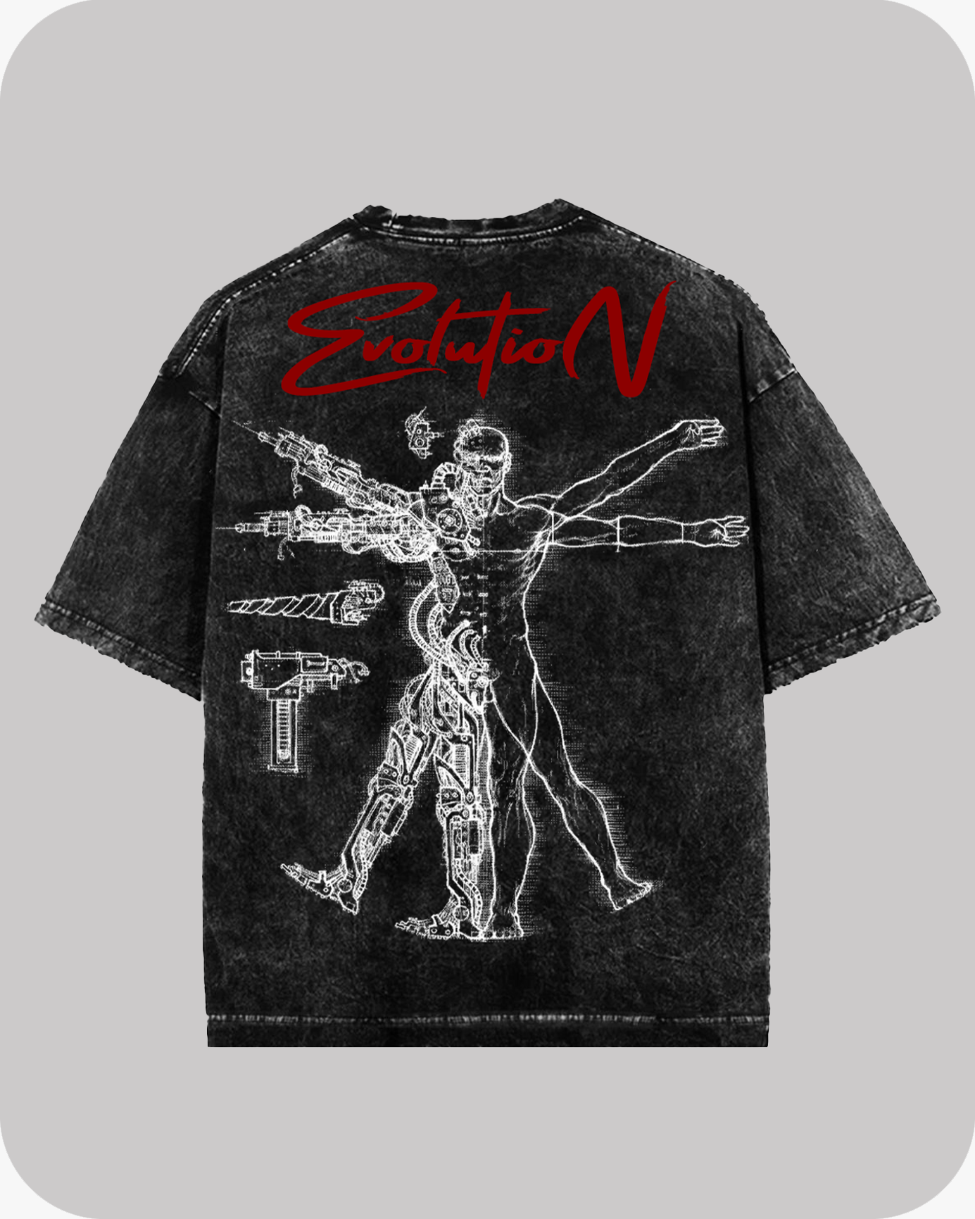 STEP INTO THE FUTURE OF STREETWEAR WITH THE EVOLUTION OVERSIZED TEE — A STATEMENT PIECE CRAFTED FROM 240 GSM 100% PREMIUM COTTON FOR UNMATCHED STRUCTURE AND COMFORT. THE ACID-WASHED FINISH GIVES IT A RAW, LIVED-IN EDGE, WHILE THE BACK GRAPHIC — A FUSION OF HUMAN ANATOMY AND ROBOTIC PRECISION — REPRESENTS THE CONSTANT EVOLUTION OF IDENTITY, STYLE, AND TECHNOLOGY.