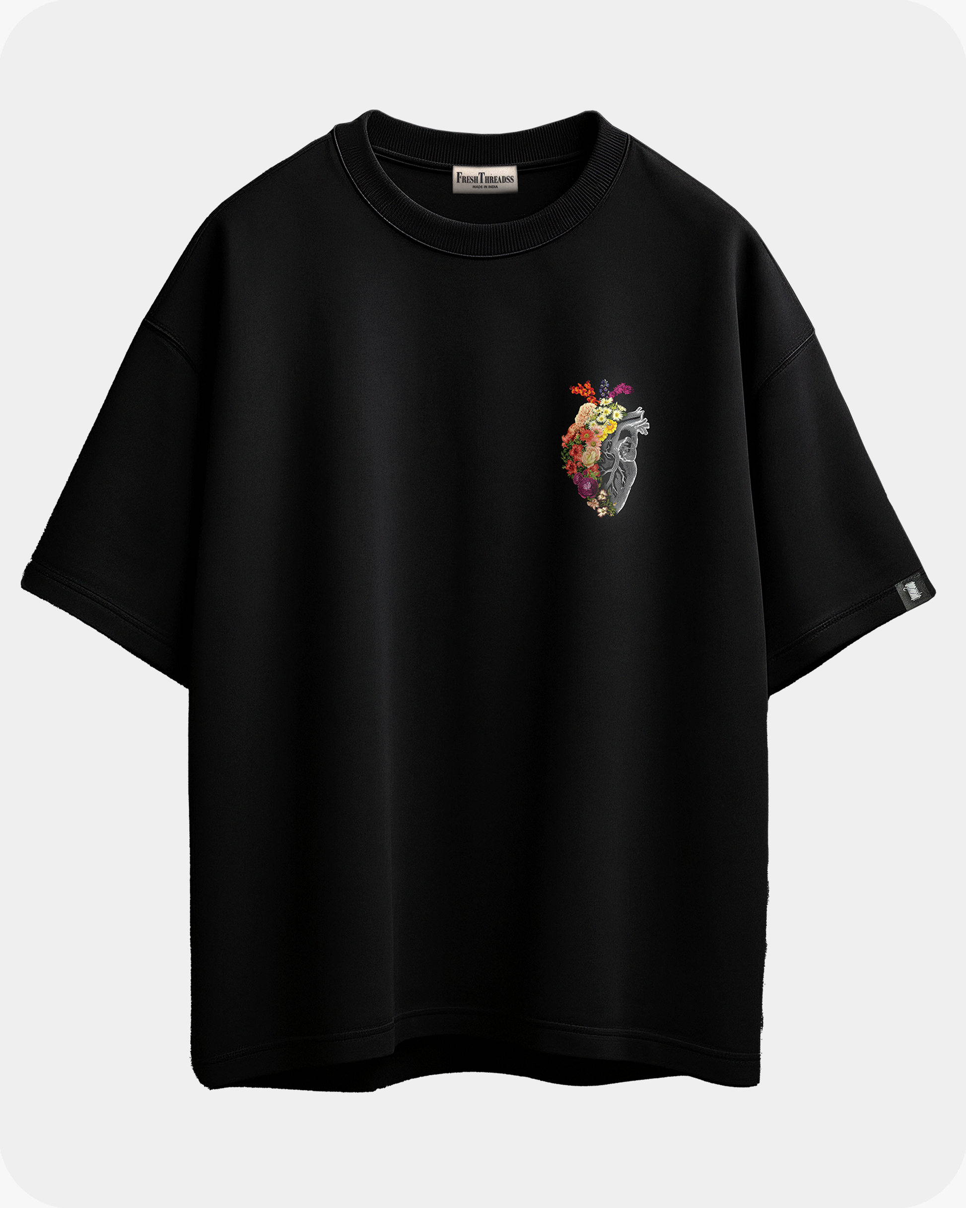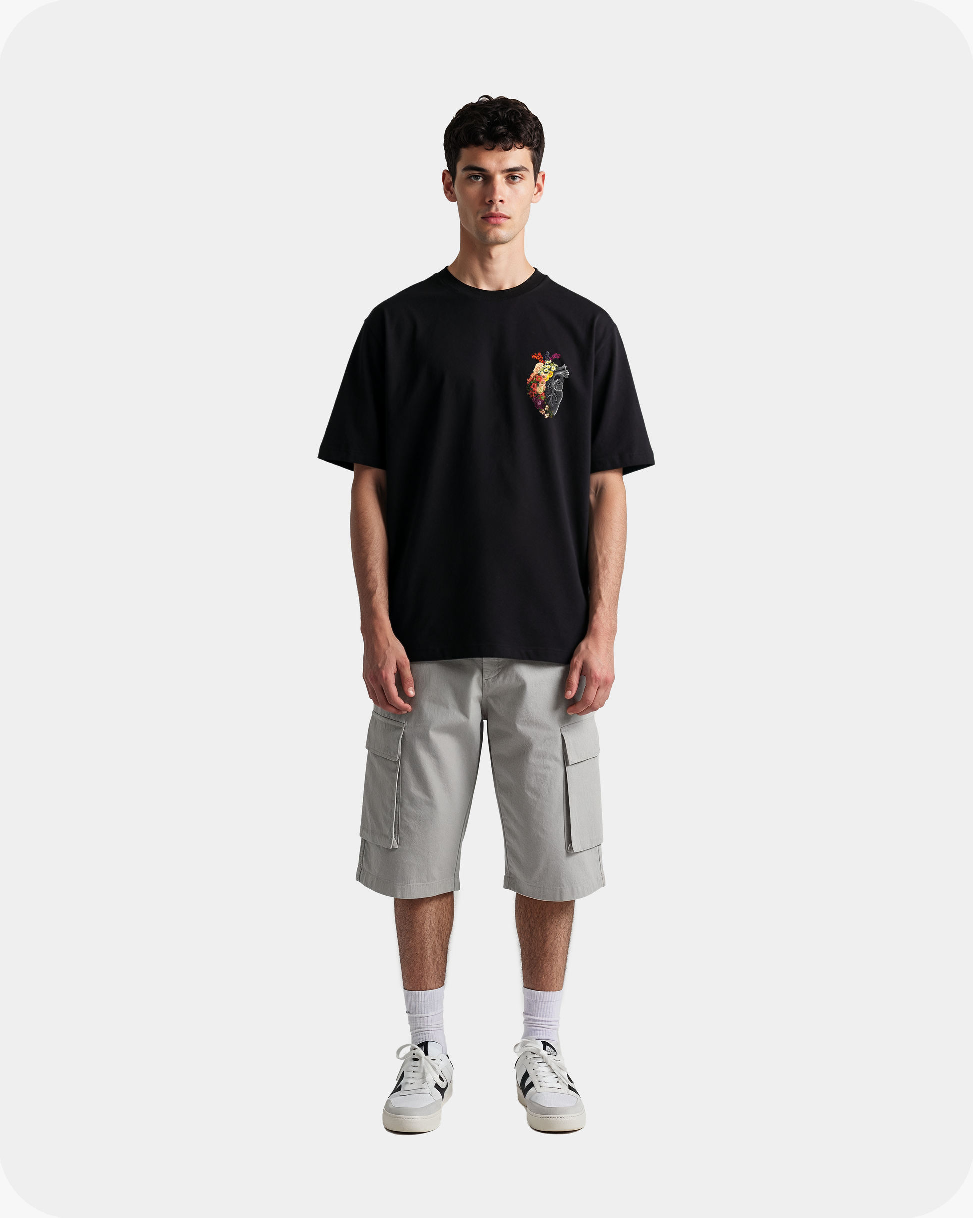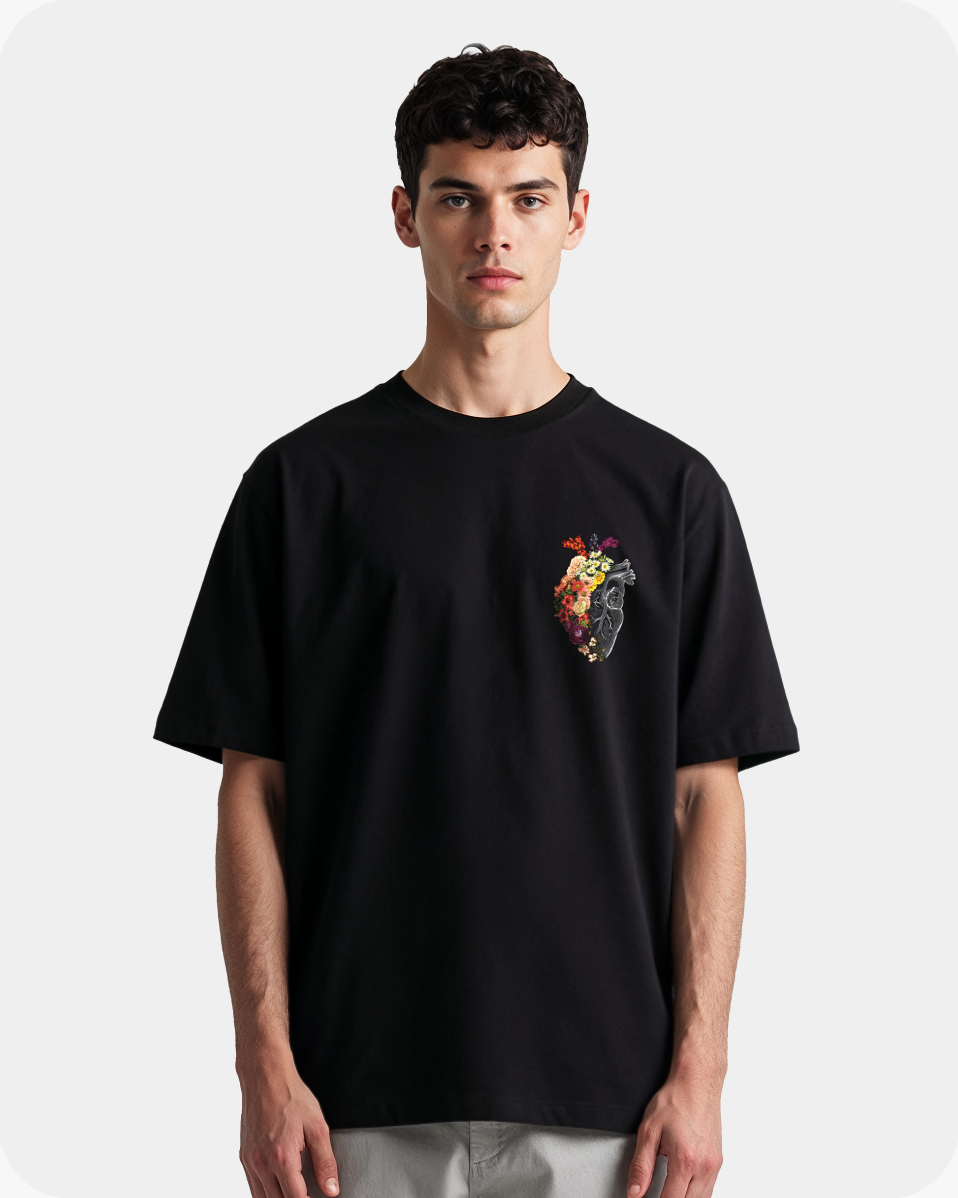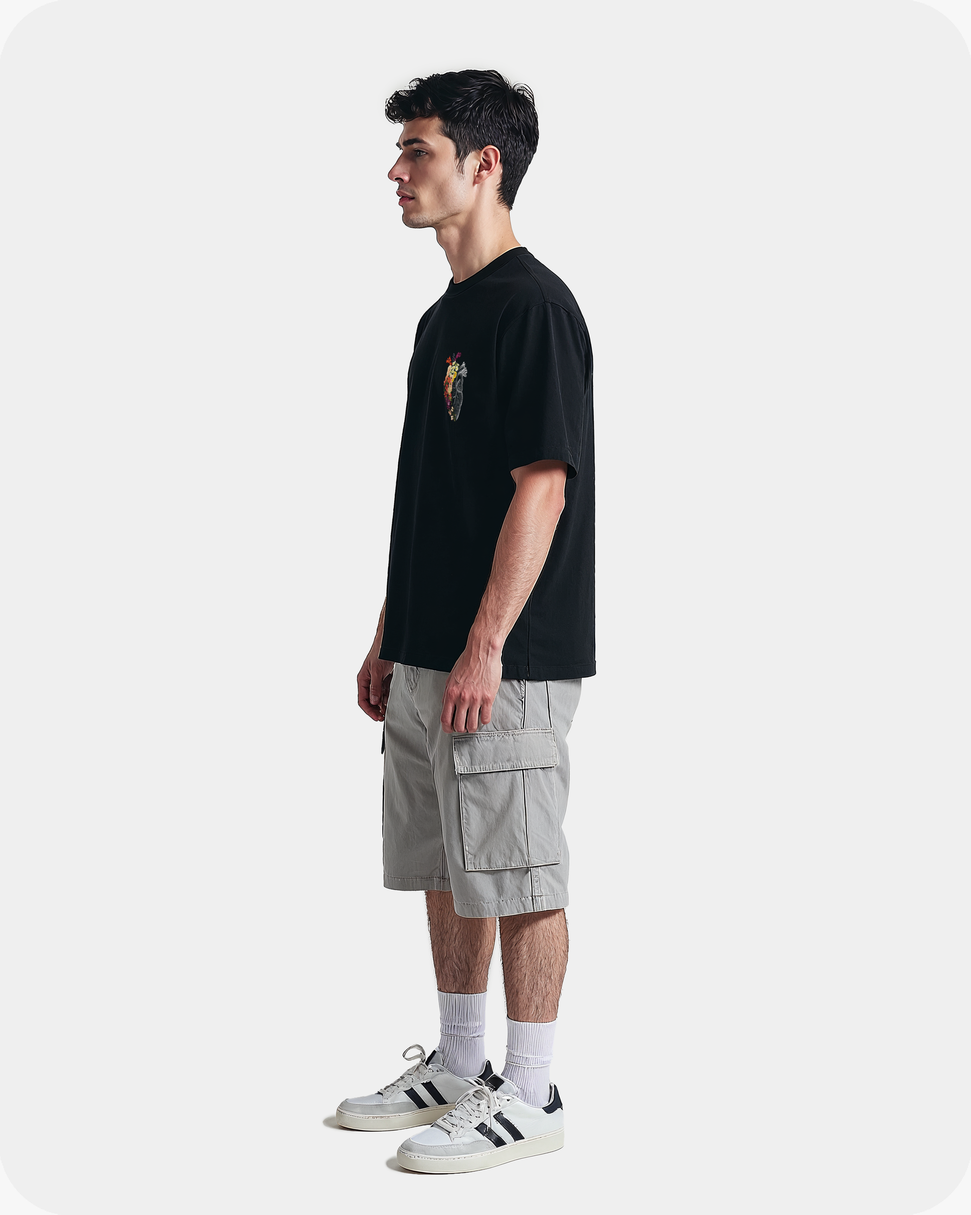 THIS TEE FROM OUR ZERO.1 COLLECTION CELEBRATES RESILIENCE AND QUIET POWER. MADE FROM 100% PREMIUM COTTON WITH A 240 GSM FABRIC, IT OFFERS A SOFT, DURABLE, AND BREATHABLE FEEL — PERFECT FOR ALL-DAY WEAR WHILE KEEPING ITS SHAPE AND STRUCTURE. THE DEEP BLACK COLOR PROVIDES THE PERFECT BACKDROP FOR THE VIBRANT FLORAL AND GRAPHIC ELEMENTS, MAKING THEM POP WITH STRIKING CONTRAST.