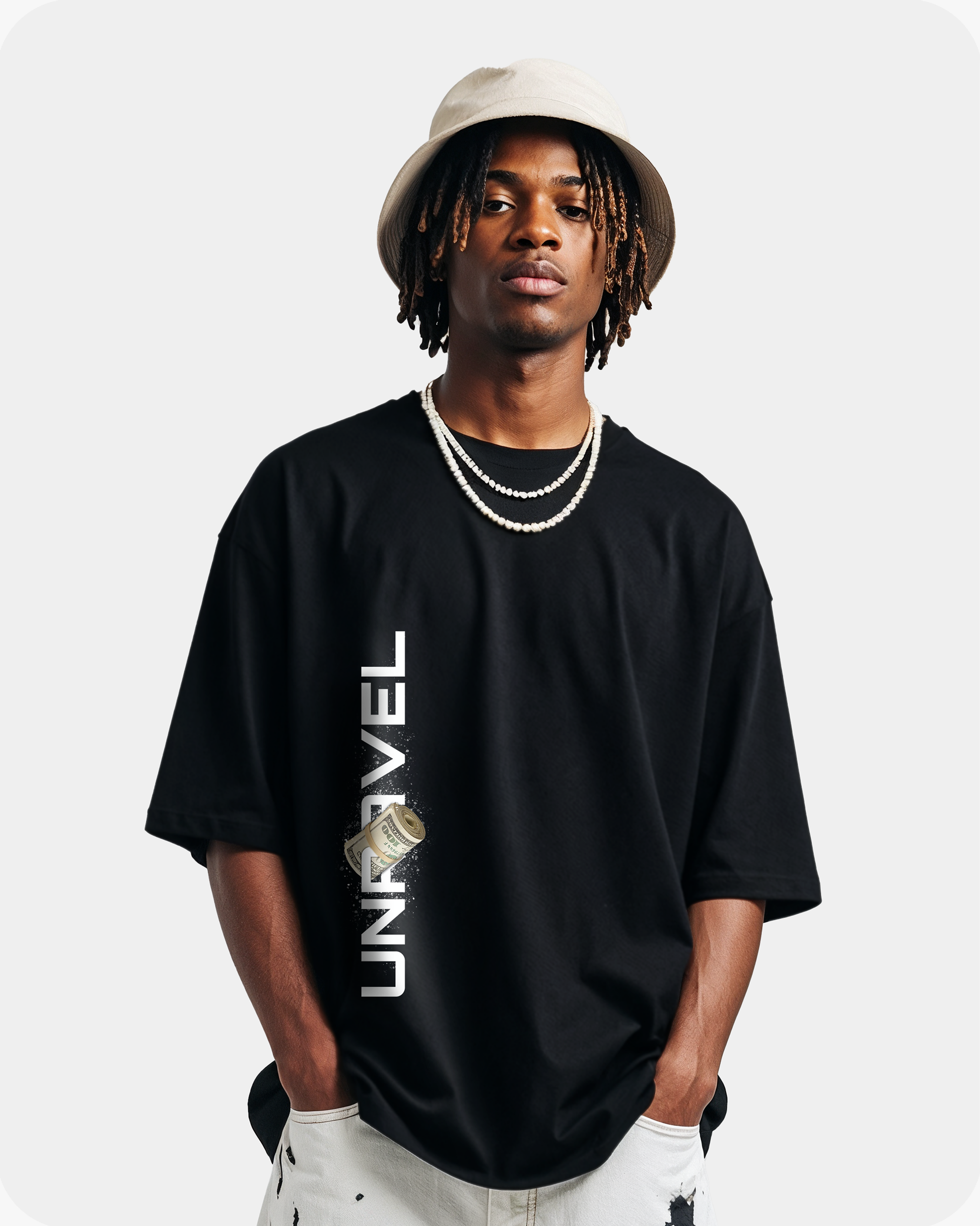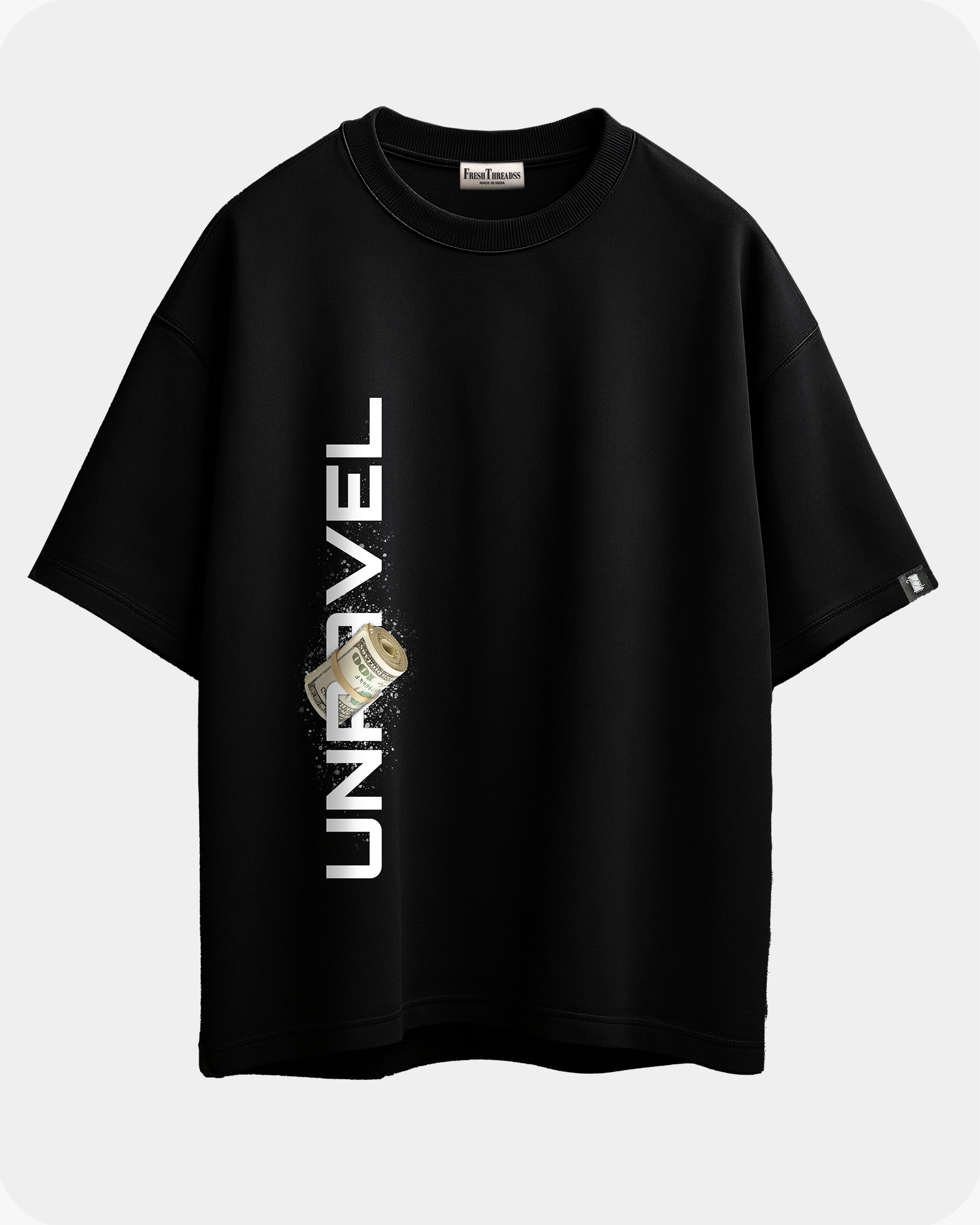 THIS BOLD OVERSIZED BLACK TEE FROM OUR ZERO.1 COLLECTION FEATURES A STRIKING "MADE OF MONEY" GRAPHIC, COMBINING MODERN LUXURY WITH ARTISTIC DESIGN. THE SHIRT SHOWCASES A DETAILED VISUAL OF A CHERUBIC FIGURE SURROUNDED BY ROSES AND STACKS OF MONEY, WITH THE BOLD TEXT ABOVE MAKING A STATEMENT: "MADE OF MONEY."