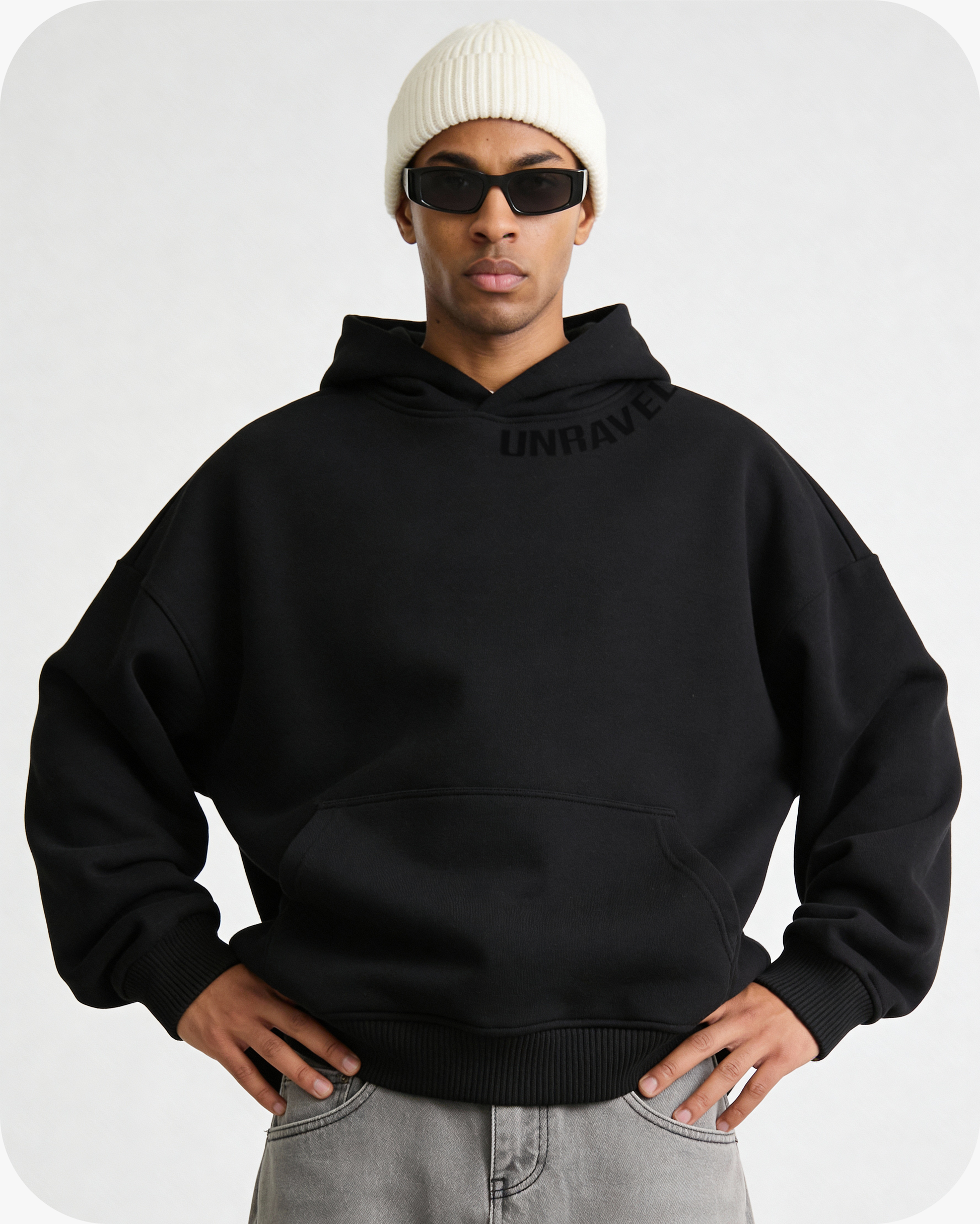 A RELAXED BLACK COTTON FLEECE HOODIE WITH SMALL "UNRAVEL" VELVET PATCH ON SHOULDER CUT OVERSIZED FOR A ROOMY, THROW‑ON FEEL — THE KIND YOU REACH FOR EVERY DAY.
